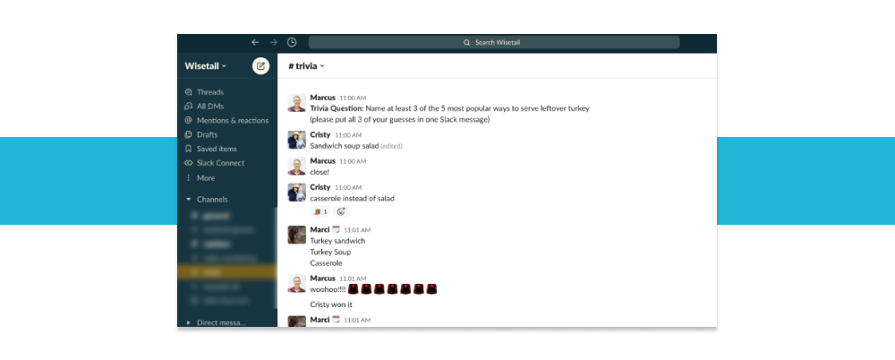 We have quite the competitive side at Wisetail, and nothing brings that out quite like our quarterly trivia event. We have brought trivia from the office to an online space through the use of our trivia Slack channel. On trivia day, the host presents a question in the channel every hour, on the hour. The first person to answer correctly wins that hour and gets a prize. Trivia winners also get a badge for their Apex profile to showcase their wit!